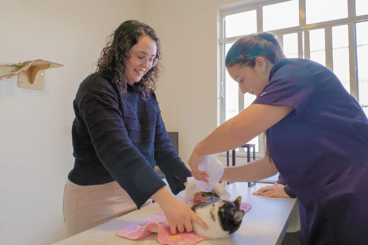 Um dos casos acompanhados pela equipe é o da gata Pixy, resgatada com feridas nas pernas e na barriga. A doutoranda Anna Claudia Capote relata a evolução do tratamento, destacando a melhora significativa do quadro clínico da felina, que hoje apresenta comportamento ativo e brincalhão.